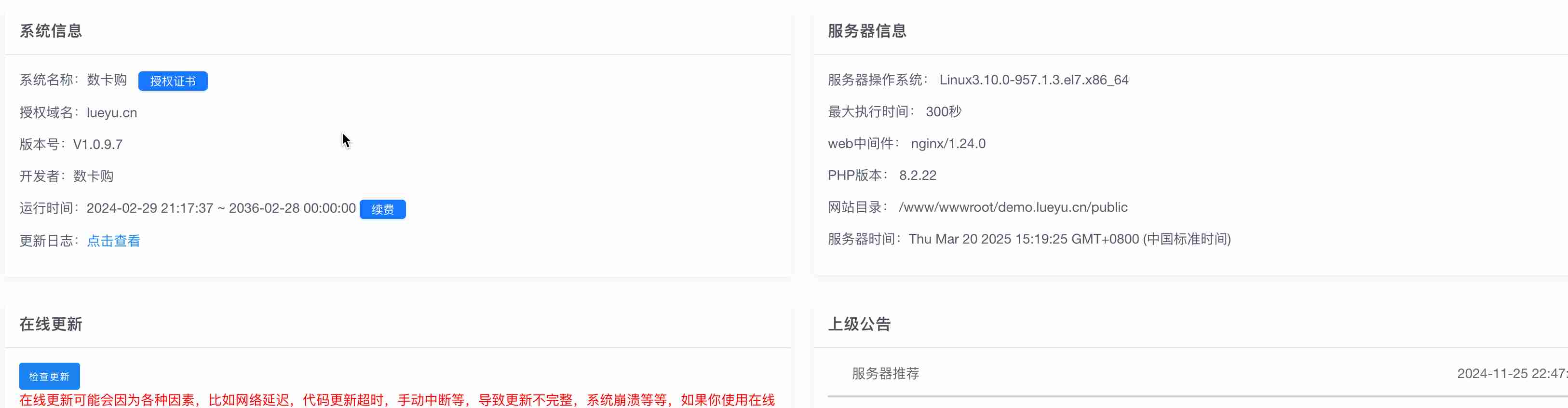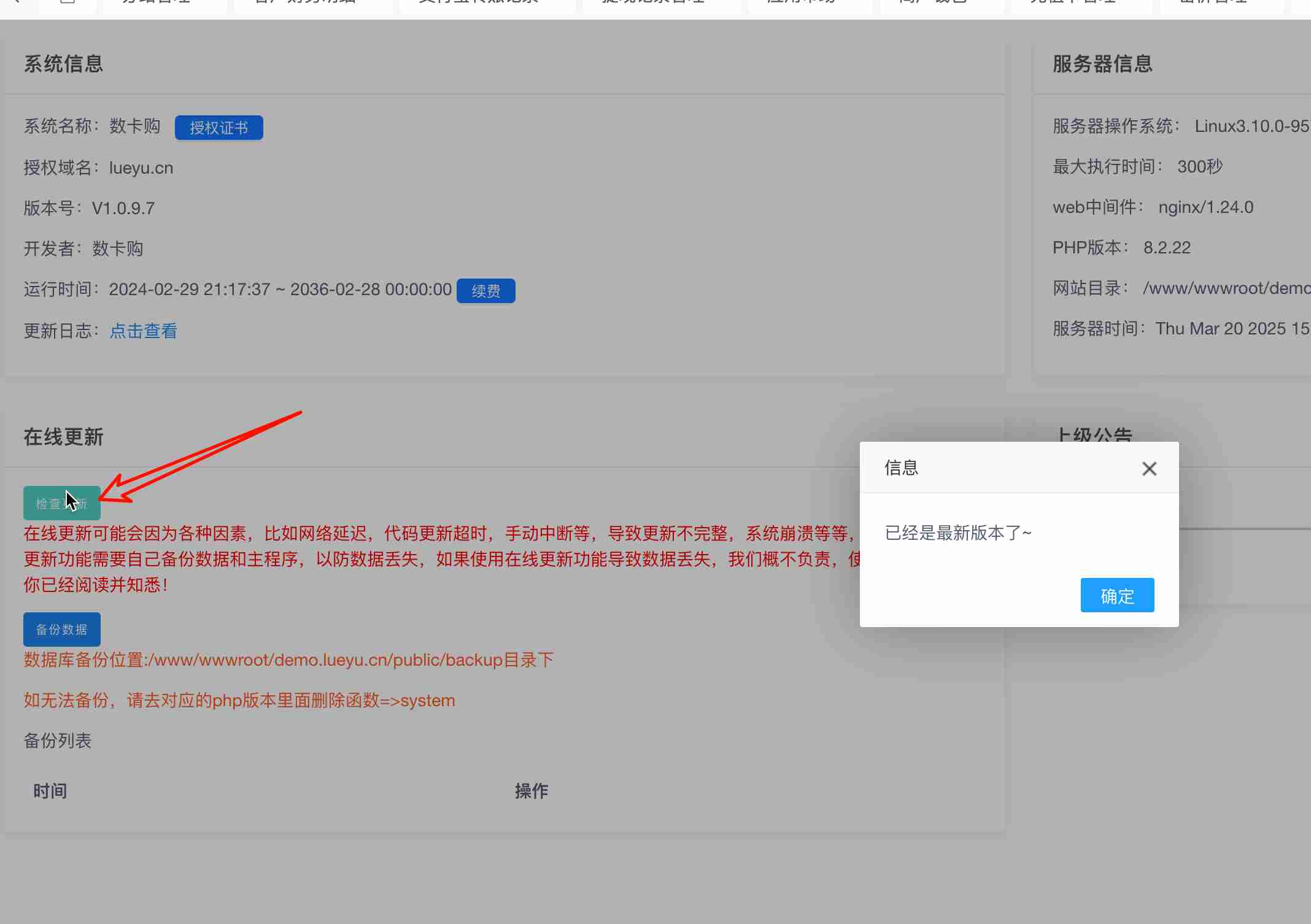 目前数卡购已支持登陆系统后台自动查询系统更新信息,无需在此界面更新