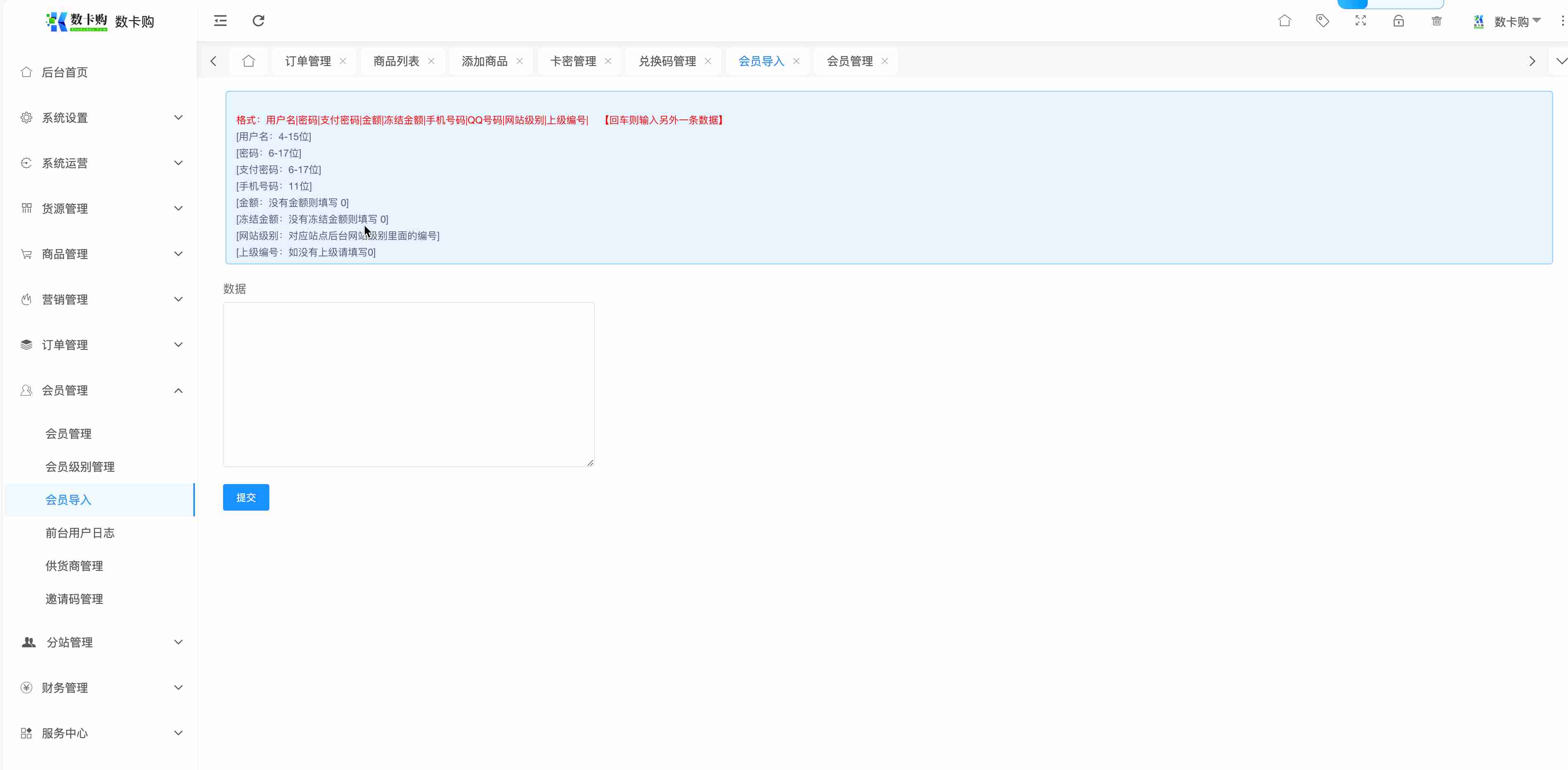 格式:用户名|密码|支付密码|金额|冻结金额|手机号码|QQ号码|网站级别|上级编号| 【回车则输入另外一条数据】