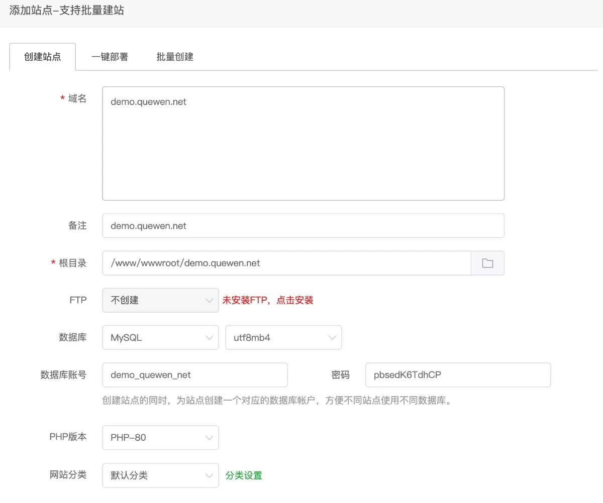 在宝塔里面点击(网站—添加站点—输入域名—创建数据库—提交)