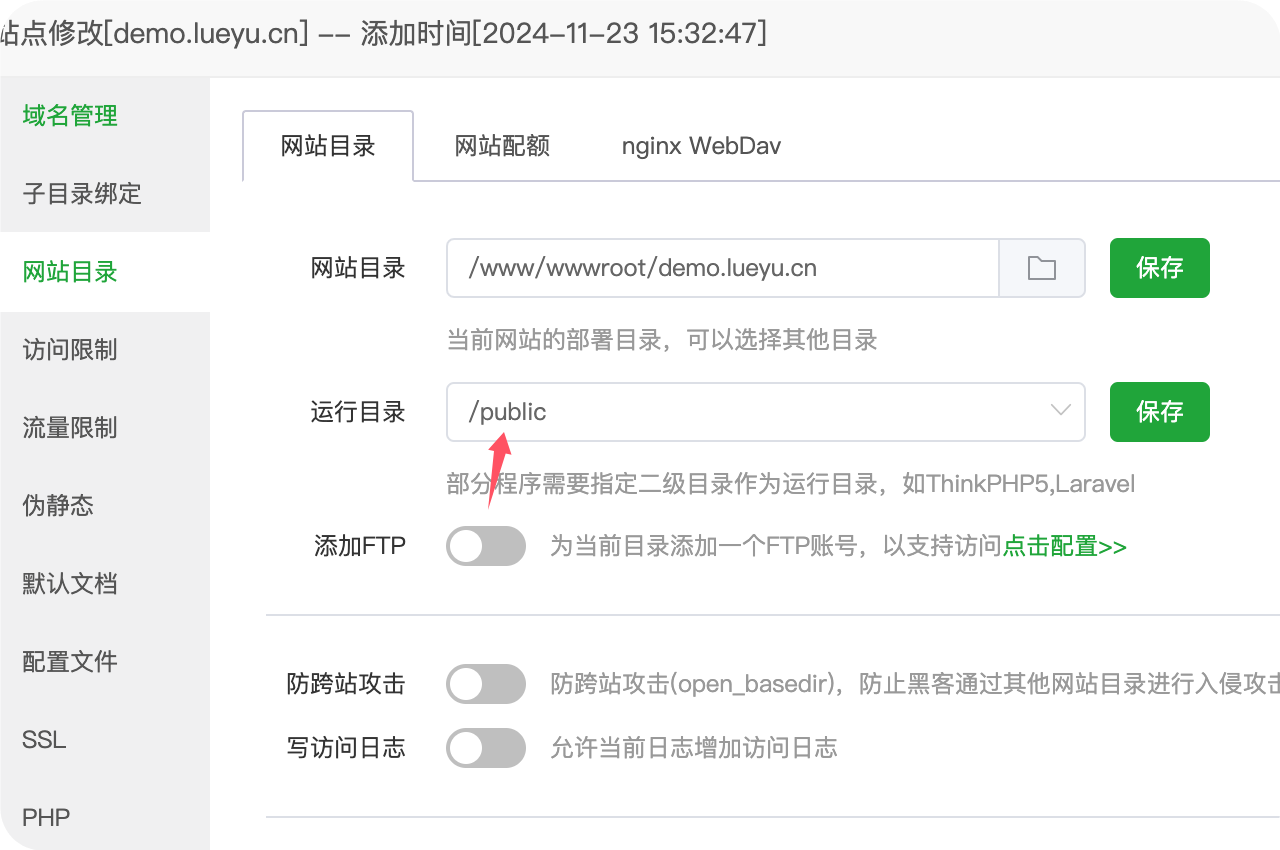 3.设置目录为public目录,并且取消防跨站
