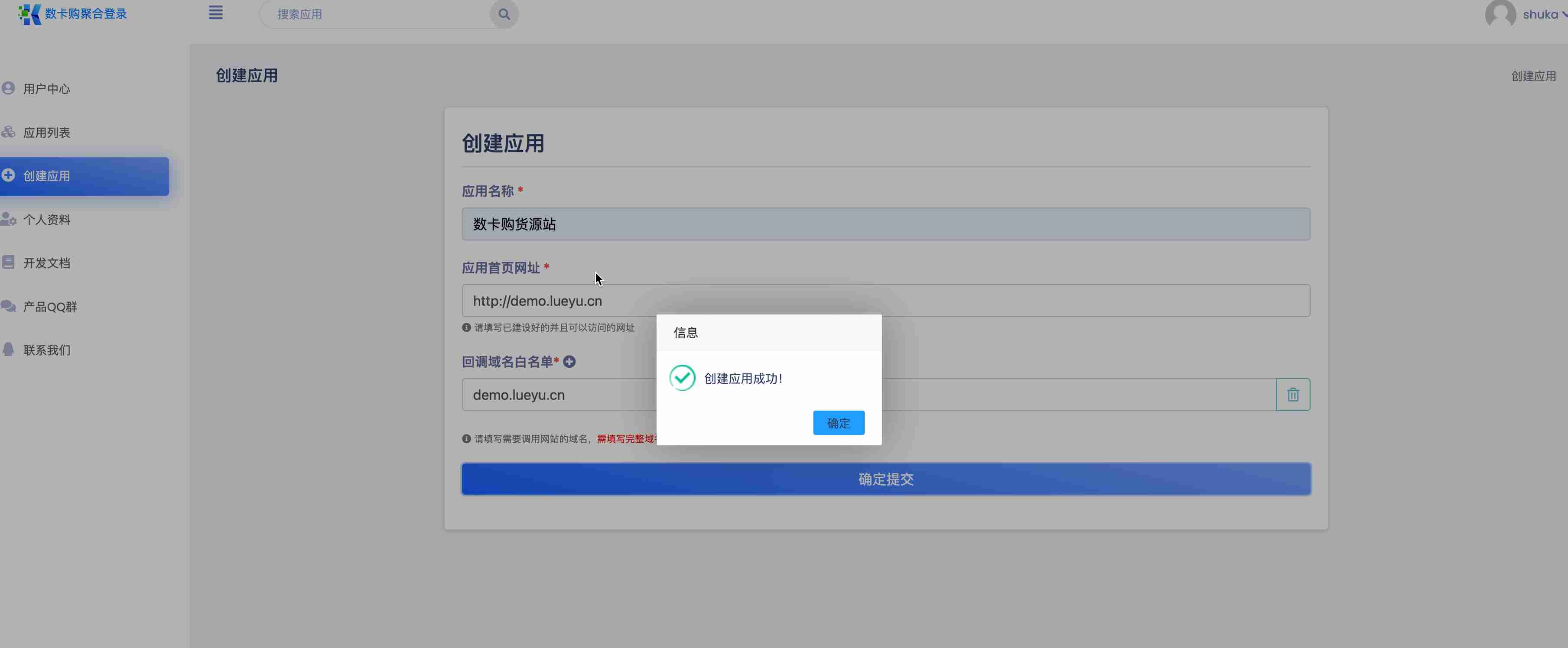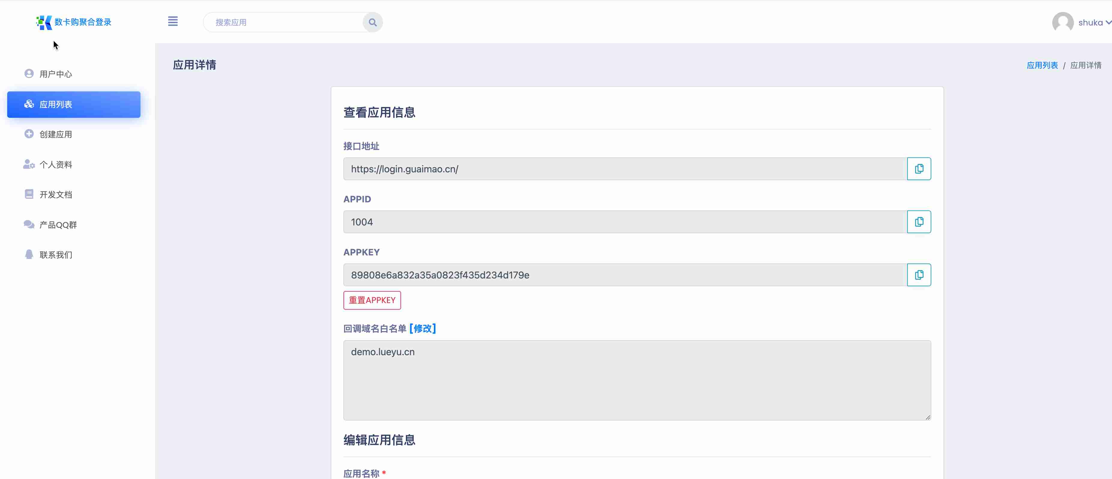 1.访问数卡购聚合登录,注册或者登陆,进入应用列表-创建应用,点击创建网站应用
