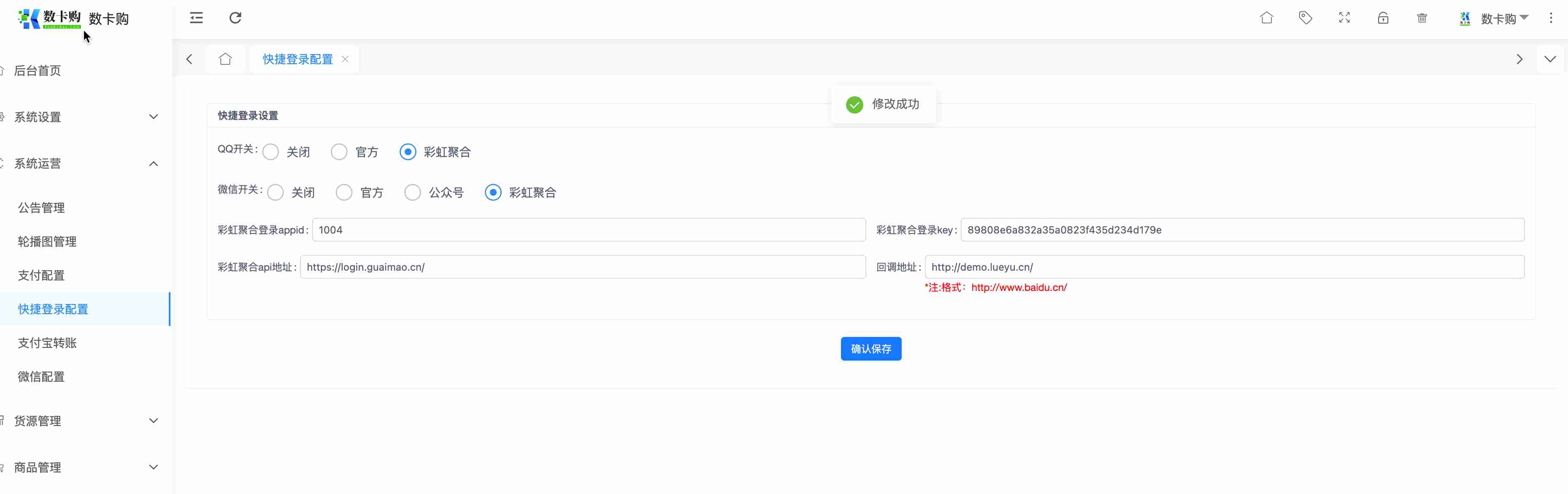 3.进入网站后台,系统运营-快捷登录配置-选择聚合登陆,进入配置。
