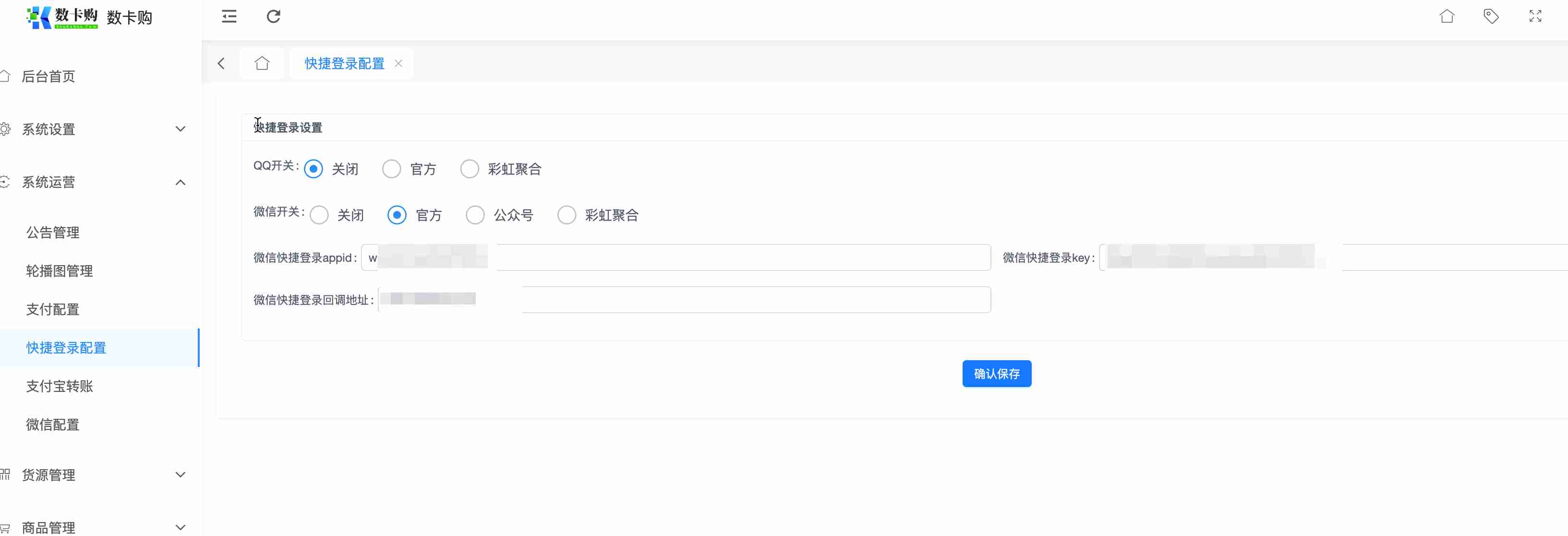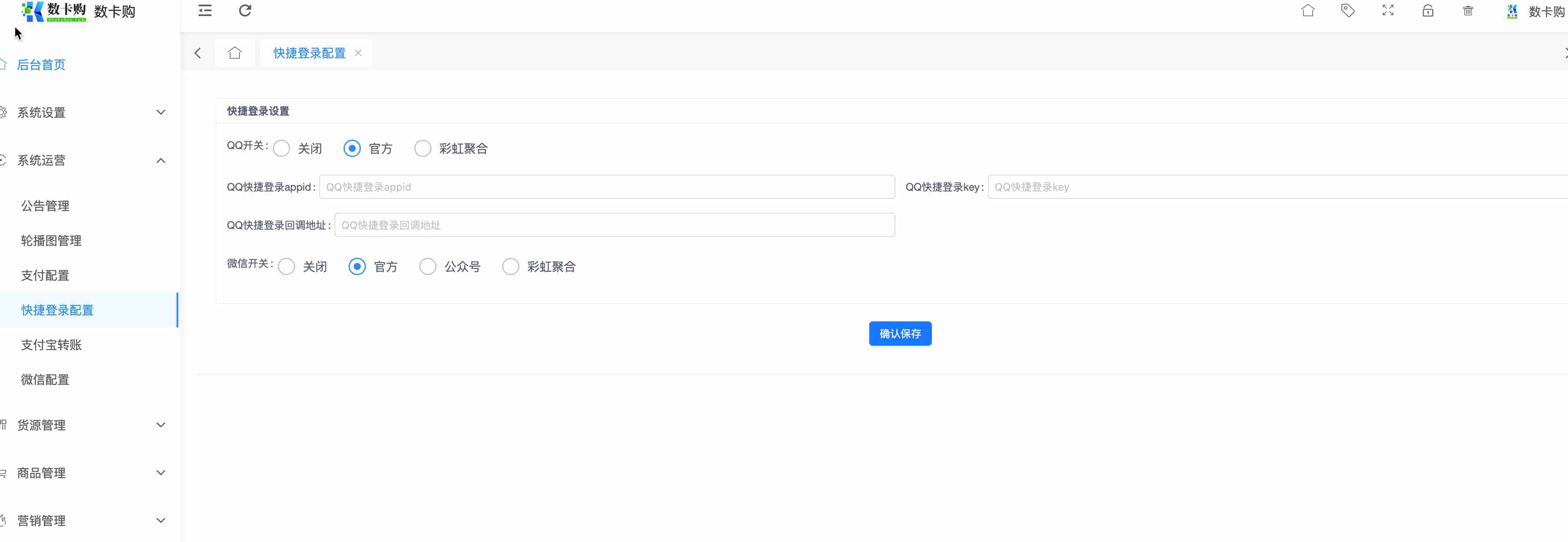 4.进入网站后台,系统运营-快捷登录配置-选择QQ官方,进入配置。