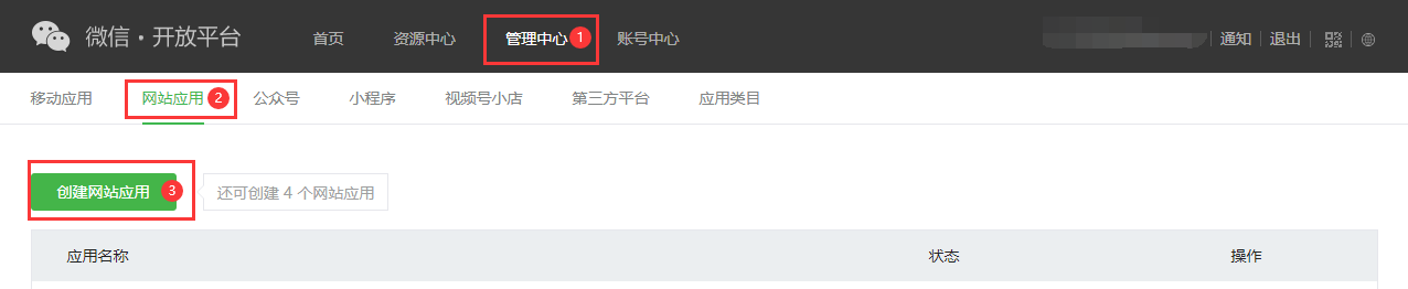 1.访问微信开放平台,进入管理中心-网站应用,点击创建网站应用(添加应用前需要确认开发者资质已认证)。
