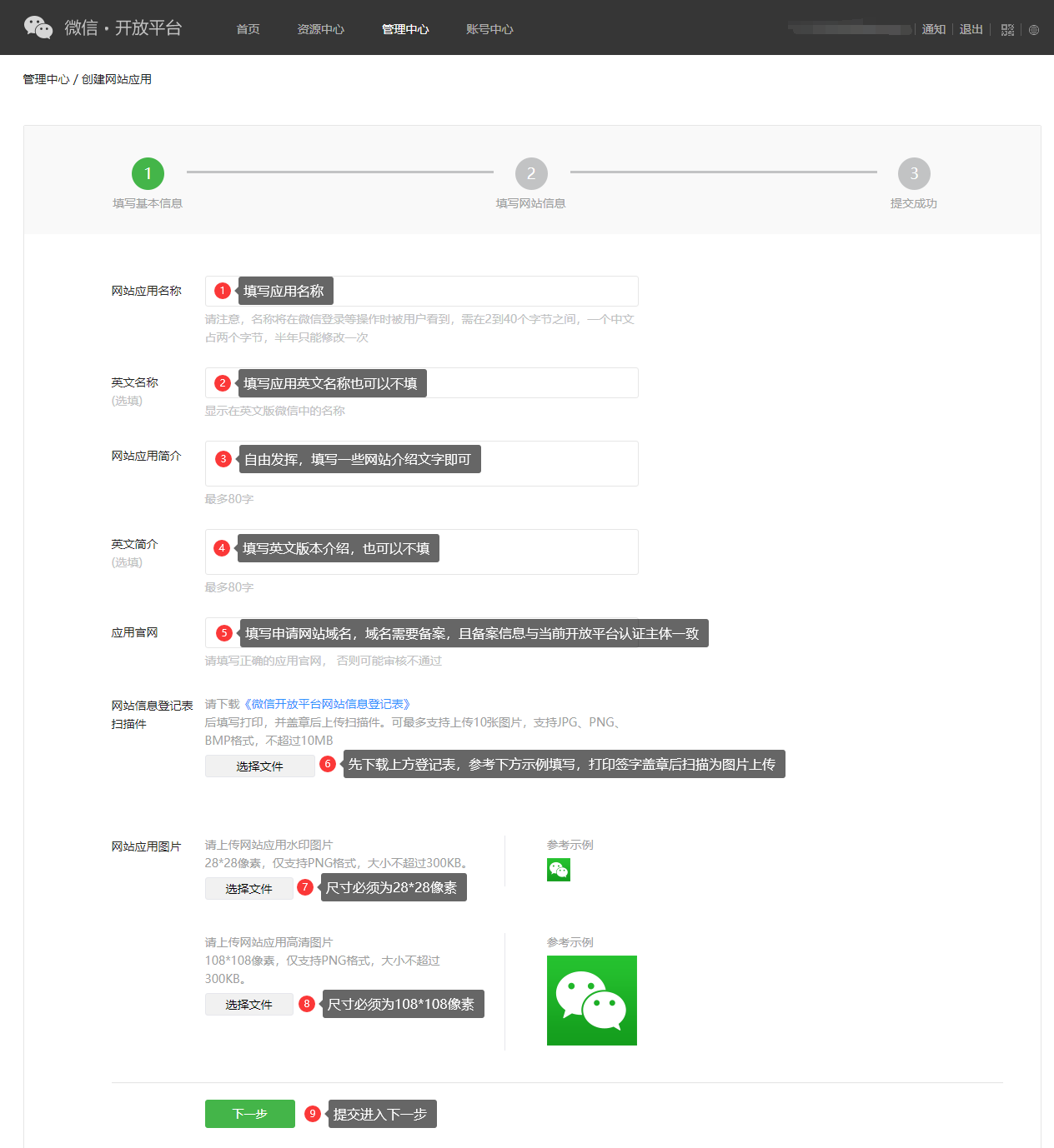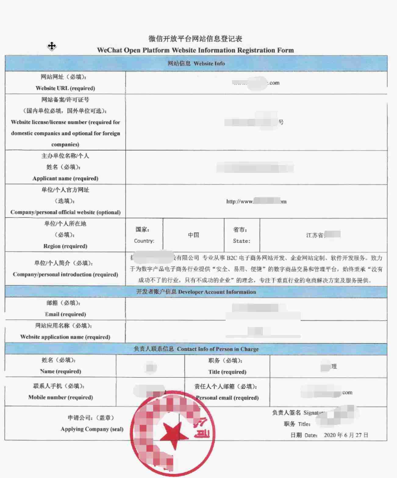 《微信开放平台网站信息登记表》填写示例: