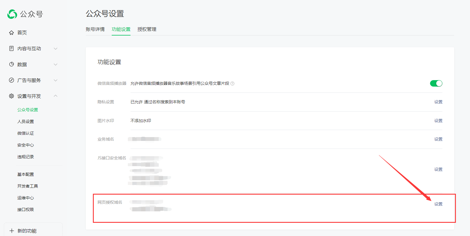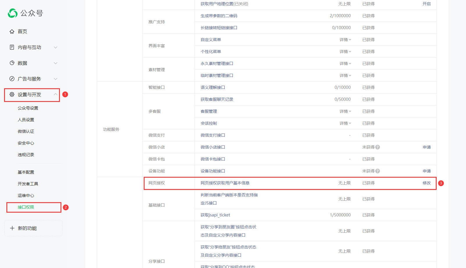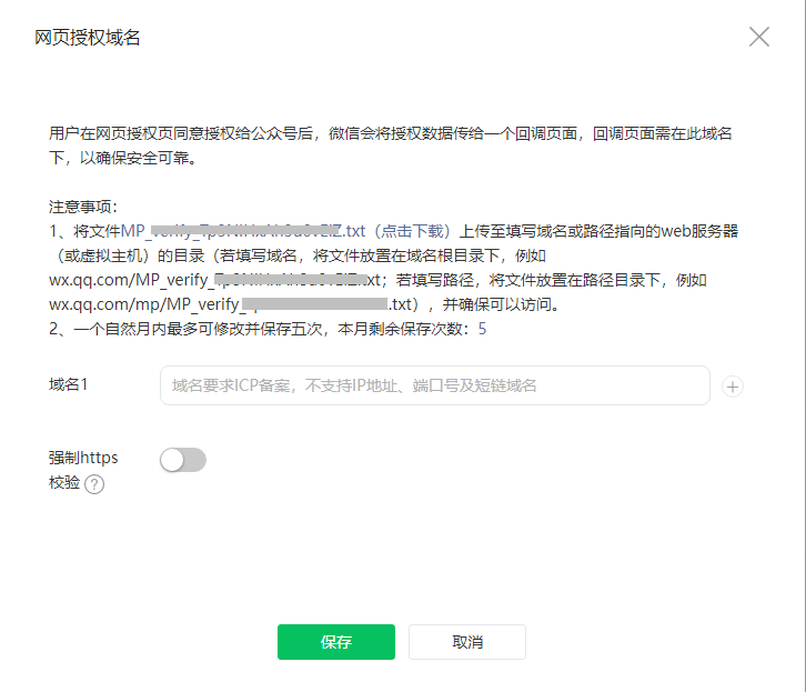 4.进入 设置与开发 - 接口权限,修改网页授权域名(上传验证文件的位置为程序根目录下public文件夹中)。