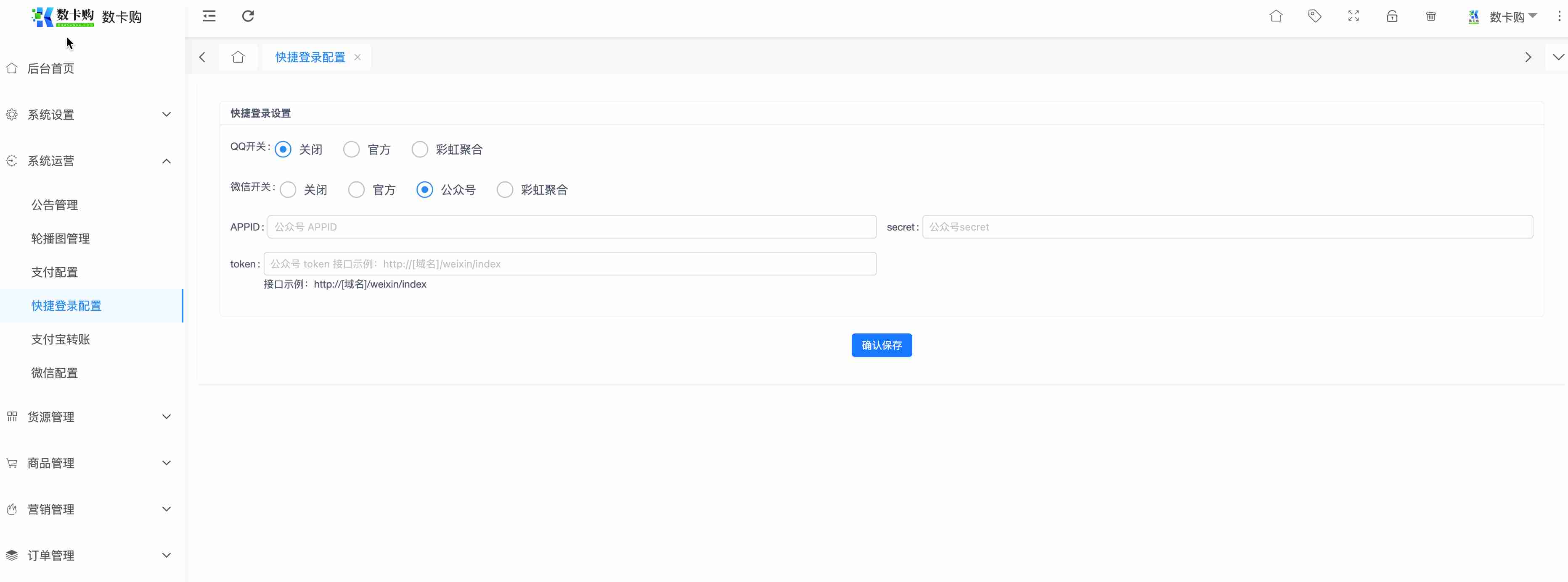 5.进入网站后台,系统运营-快捷登录配置-选择微信官方,进入配置。