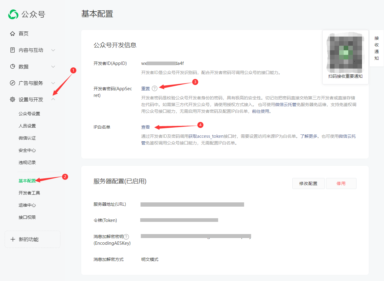 3.进入 设置与开发 - 基本配置,开发者ID(AppID)保存备用,开发者密码(AppSecret)获取后保存备用,IP白名单中添加网站所在服务器IP。
